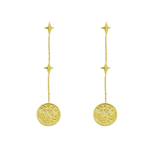 Long star ear drops when swinging by the ears, are elegant and vivid.The star pattern in the veneer is mysterious and unique.Material: 925 Sterling Silver with18K gold plating. Size: Length of the Earrings is 6.5cm, and the Pendant is 1.8cm in Diameter.
