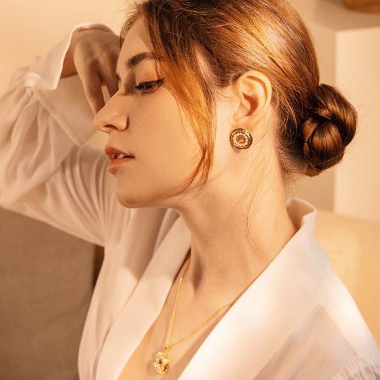 Inspired by the mystical language of tarot, this collection features five golden coin pendants -